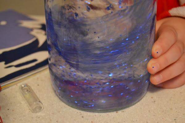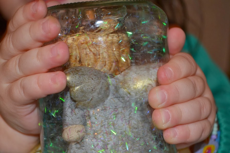 Mientras llené los tarros con agua y puse a las niñas a investigar que purpurina les gustaba más. Se lo pasaron bomba removiendo tarros y echando purpurina. Increíblemente no mancharon mucho........Pero yo si: la primera bolsa que utilicé para pintar las tapas estaba agujereada.... casi infarto cuando la levanté...Y NO SALÍA CON NAAAADDAAAAA... Cuando pude respirar rítmicamente miré en internet y os informo que la pintura en spray se puede quitar con quitaesmalte sin acetona (tambien con acetona pero puedes estropear la superficie que estés limpiando, prueba primero donde no se vea). Bueno, que tuviemo un final feliz......fffiuuuuuuuuu