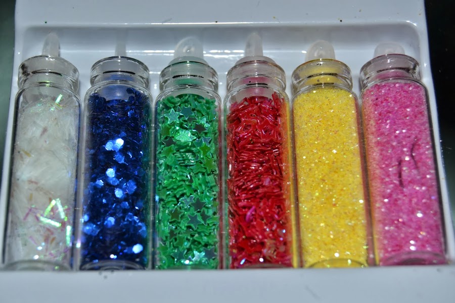 Glicerina. Me costó un poco encontrarla, me la vendieron en una droguería de esas "de toda la vida". Tampoco es imprescindible, sirve para dar más densidad y que la purpurina tarde más en caer.