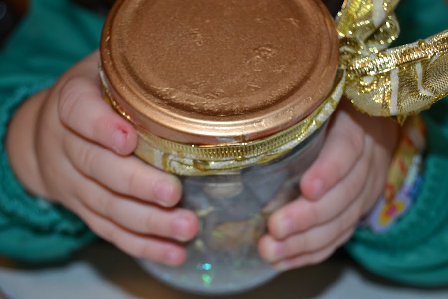 Lo primero que hice fue pintar las tapas de dorado. Es que no me parecía que quedase muy bonito con las tapas esas de mermelada y se supone que la bola es para darle la vuelta y agitar.