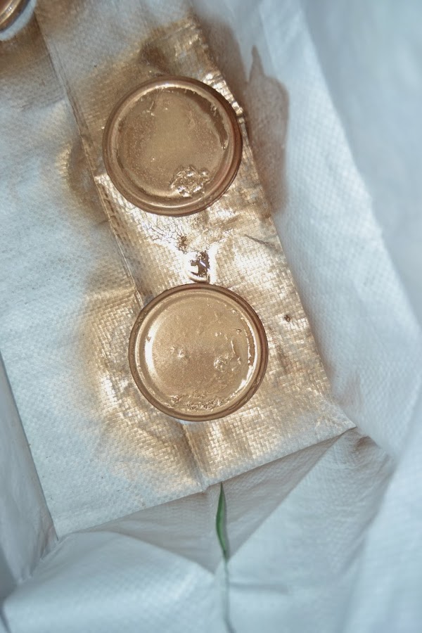Dentro de una bolsa y en un sitio aireado metí las tapas y las pinté con el spray. Consejo: poca cantidad cada vez para que no gotee o queden grumos y a distancia queda más uniforme. Esto lo digo porque yo lo hice mal.