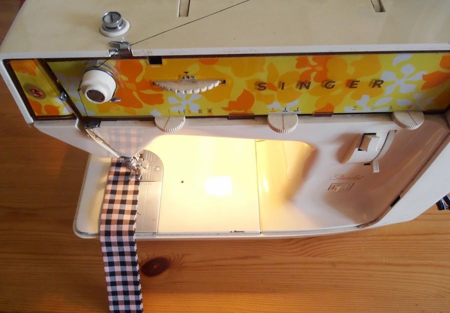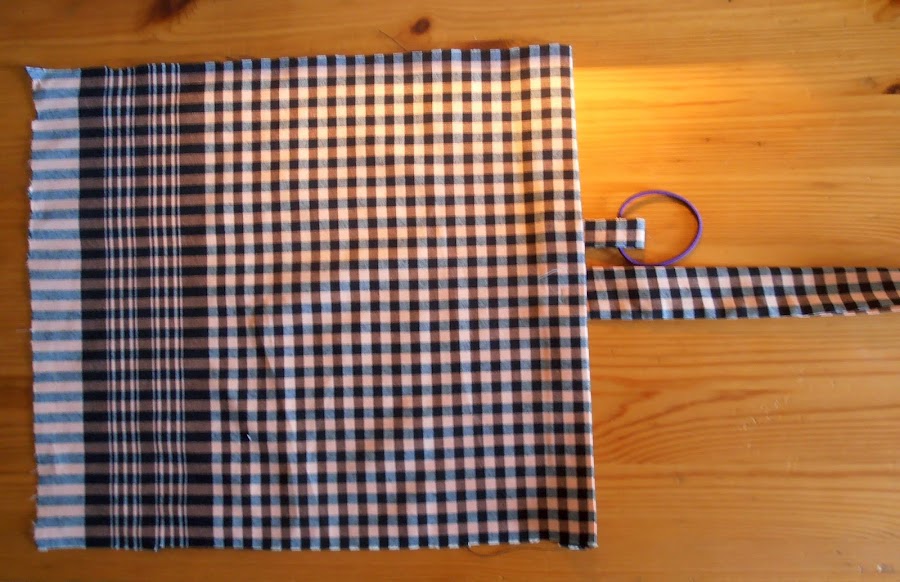 Plancho el asa, y la embasto junto con la pequeña tira, (que también he cosido del mismo modo que el asa y a la cual le he puesto una cinta elástica), a una parte de la bolsa, y lo coso con la máquina.