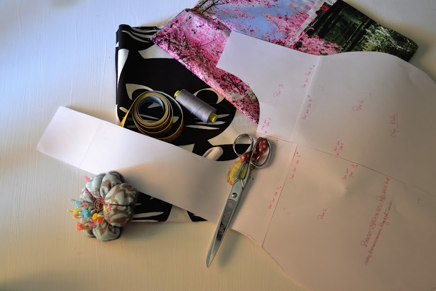 - 75 cm de cada una de nuestras telas. Yo he elegido un algodón japones con estampado de naturaleza y una loneta de gatos en blanco y negro.