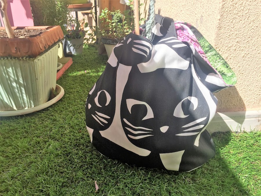 Luego ponemos derecho contra derecho y por el revés vamos a coser, poniendo estiradas las dos telas y encima de una la otra, quedaran derecho contra derecho de gatos contra tela de naturaleza y coseremos la parte interior de los asas, desde la corta parando por la larga hasta la otra corta y por el exterior un pespunte solamente en la parte del asa larga. Podéis verlo mejor en las imágenes y vídeo.