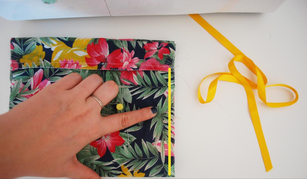 Doblaremos la tela enfrentando los derechos de la tela y cosemos los laterales, ¡dejando sin coser la parte del dobladillo! Ya que será por allí por dónde pasará el cordón que pondremos.