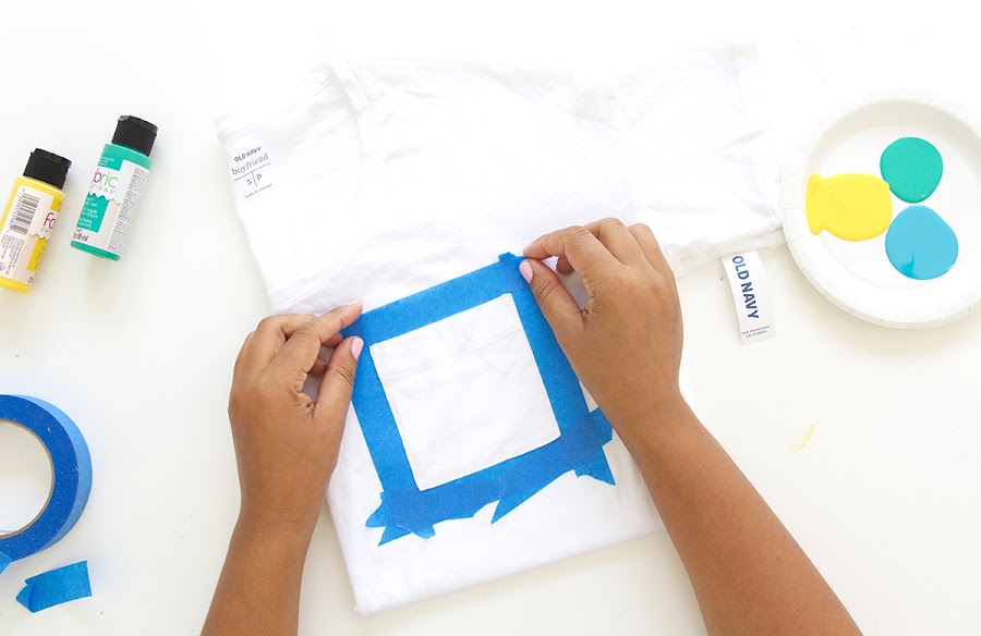 1. Empezamos protegiendo el bolsillo de la camiseta con cinta de carrocero, y con un cartón por dentro del bolsillo, para que al pintar no manche la tela de abajo.
