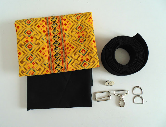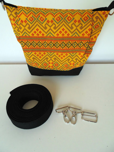 Materiales utilizados - tela amarilla y negra - dos mosquetones - dos pasadores - un tensor -1,20m de tira para la asa del bolso - Entretela