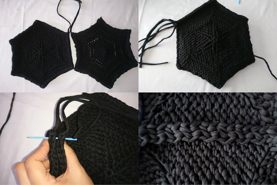 Hay que hacer dos piezas que uniremos posteriormente, con la parte del revés enfrentada, cosiendolas con el mismo trapillo.
