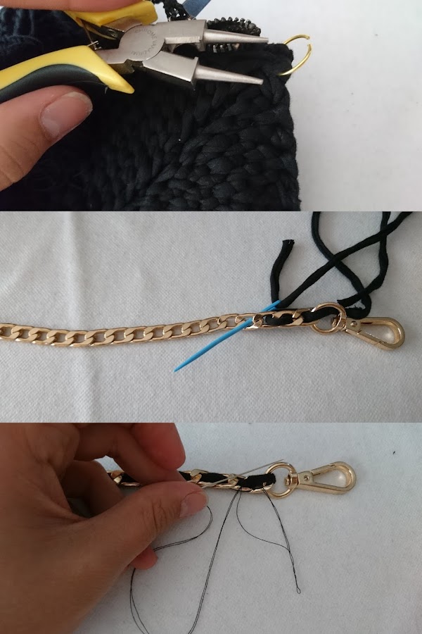 Por último, queda poner las arandelas con ayuda de un alicate (Puse dos a cada lado para asegurar), y de ahí engancharemos la cadena. Para que quedara mas lucida, entrelace el trapillo por ella. Y para dar el toque bohemio, unos flecos en la parte de abajo, y ¡Listo!