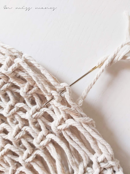 Una vez hechas las dos partes iguales, las uní con otro trozo de cuerda y pasando la aguja entre ambas por los huecos y nudos.