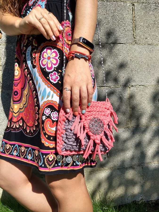 Tenía unos restos de trapillo en casa que me habían quedado de sabe dios qué, pero que a modo de tontería los he usado para este bolso. Y como no me gustan los bolsos sosos, le he añadido unas monedas y un aplique en la parte central del cierre.