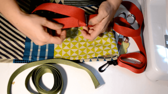 Para poner los tirantes lo que hacemos es poner un extremo de cada cinta, yo elegí una verde y otra roja. Pongo la roja en el extremo exterior izquierdo de la parte de fuera del bolso y la verde en el extremo interior derecho. Queda enfrentadas. El otro extremo lo que hacemos es poner un regulador del asa, para poder acortar o alargar a nuestro gusto y ponemos también un mosqueton y rematamos el extremo.