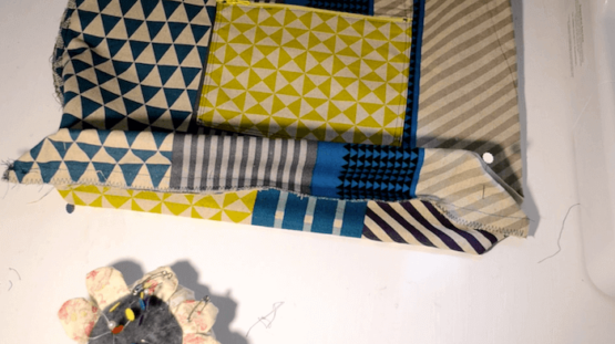 Ahora nos queda la base del bolso, primero hacemos una costura plana en la base, después lo que hacemos es enfrentar el centro de la base con el centro lateral y en el triangulo que queda dar un pespunte.