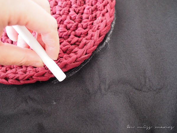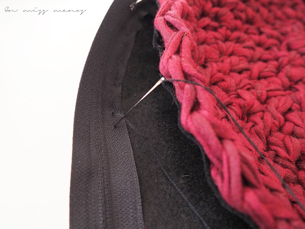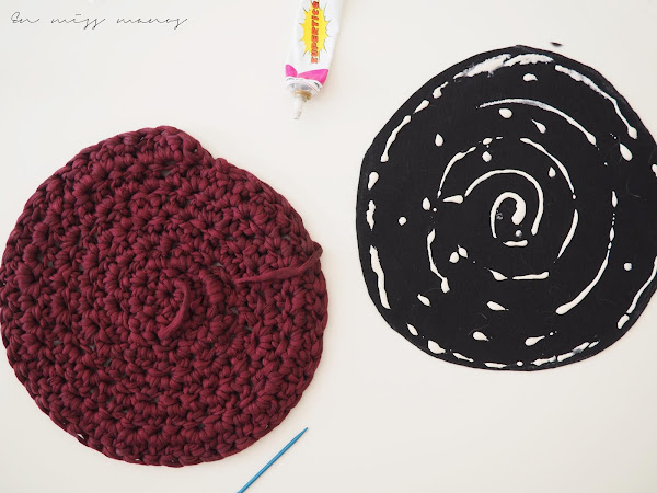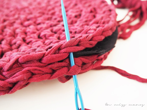 Cuando ya tenía los dos forros pegados, uní ambas partes con la aguja lanera y pasando una tira de trapillo entre las dos partes a modo de costura,