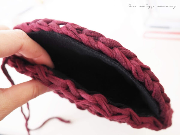 Utilicé restos de trapillo en color burdeos, una cadena que le quité a un bolso que tiré hace tiempo, una cremallera en color negro, fieltro también en color negro para el forro...