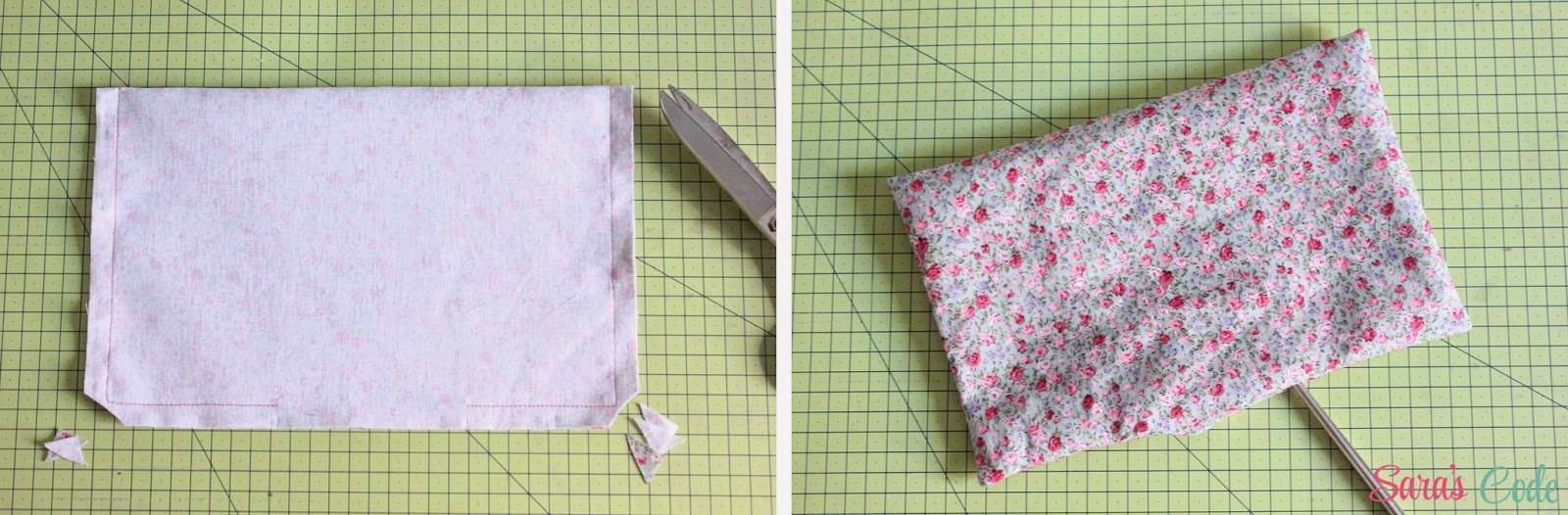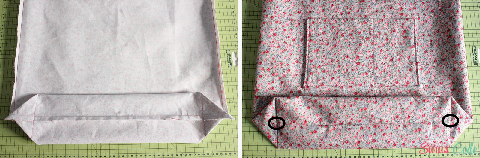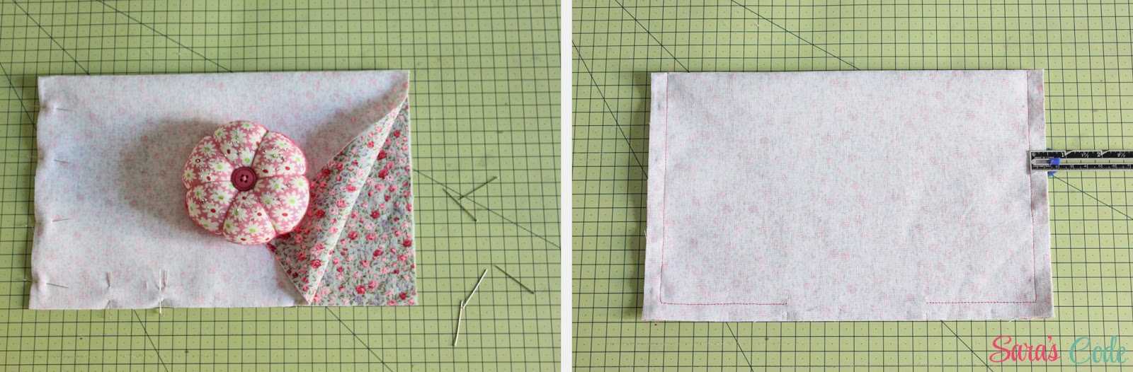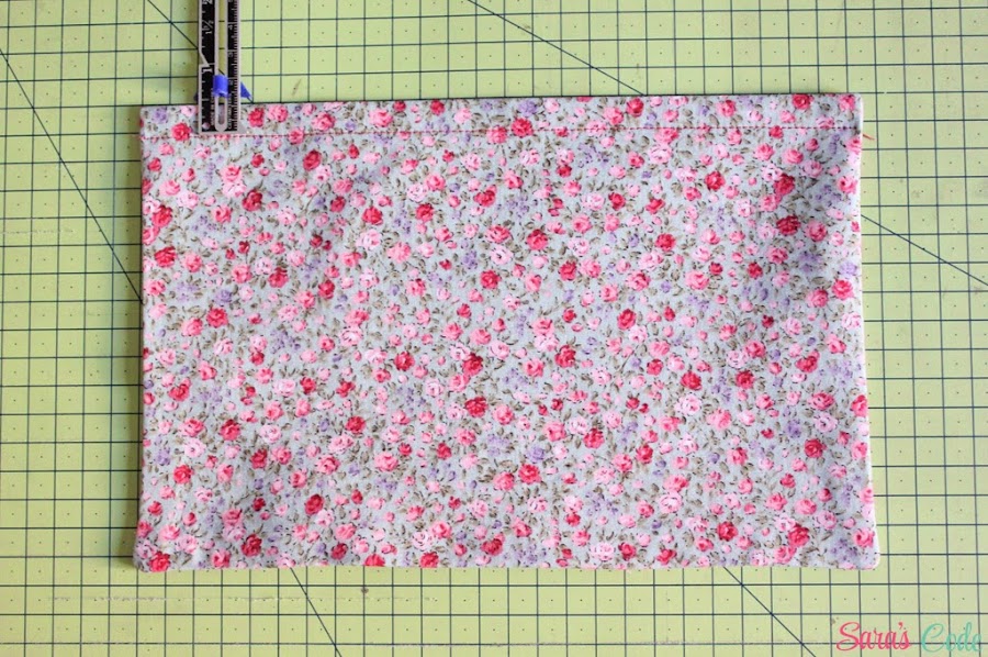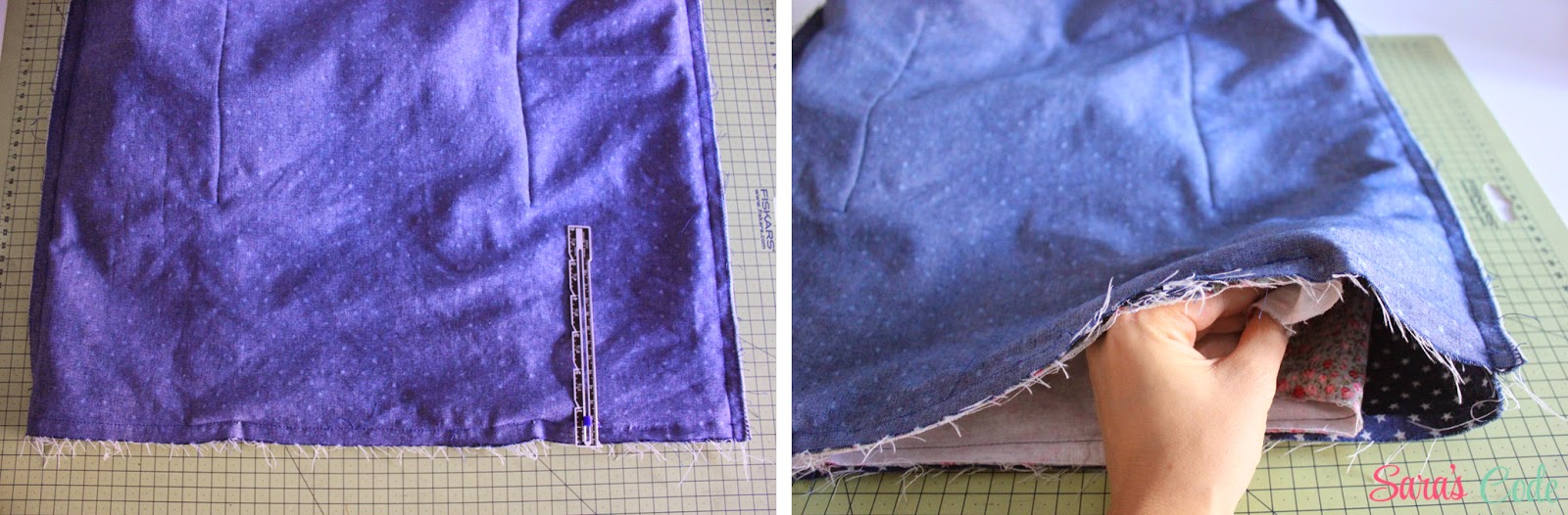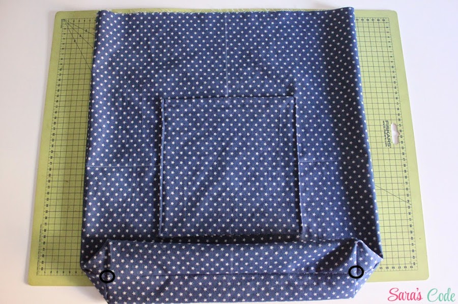 En este caso, cosemos el bolsillo a 6,5" (16,5 cm) de los bordes pequeños y a 5,5" (14 cm) de los bordes más largos.