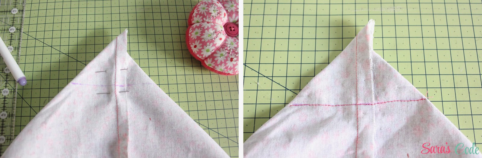 ? Con los dedos hacemos coincidir las costuras del borde inferior y del lateral, trazamos una línea a 2,5" (6,5 cm) de cada esquina y prendemos con alfileres.