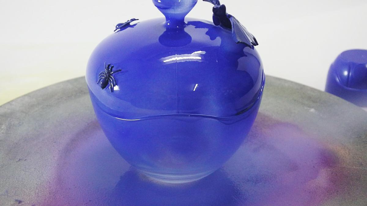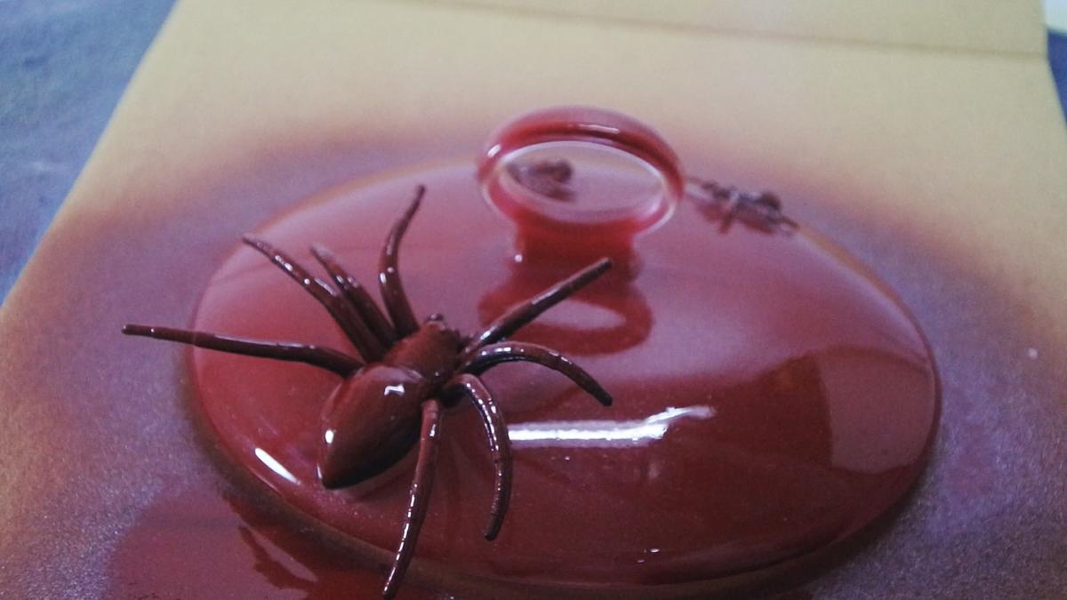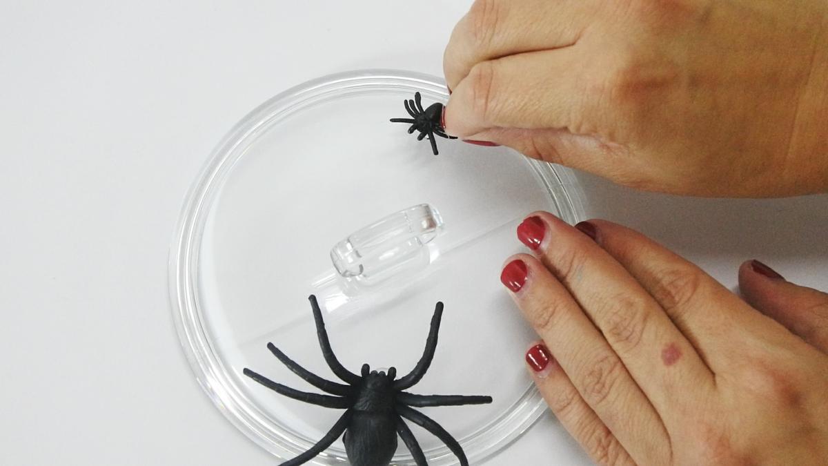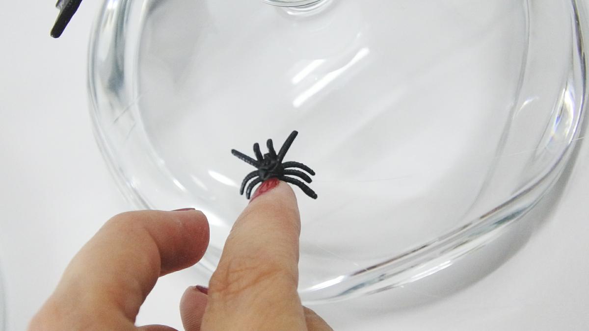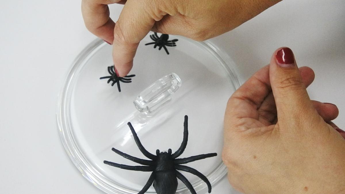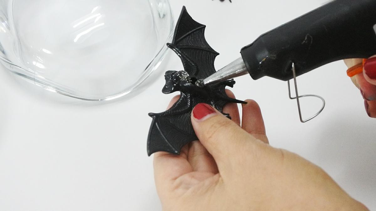 Para comenzar, pegamos con la pistola de silicona caliente sobre las dos bomboneras de cristal diferentes insectos y bichitos. Yo he elegido arañas de distintos tamaños y un murciélago. En esta época del año podéis encontrar bichitos de todo tipo para decorar.