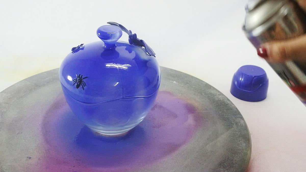 Hemos elegido esta pintura por su acabado, me encanta ese efecto metalizado que deja, en el que, en este caso, al pintar sobre cristal, paree que la bombonera sea de otro material. Y además, por la rapidez del secado.