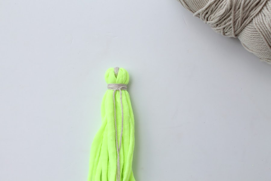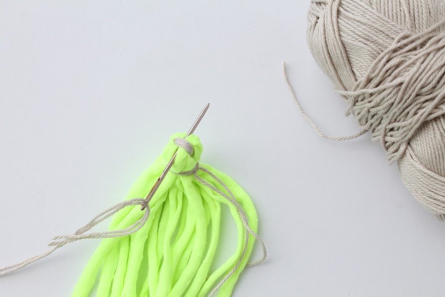 Manteniendo las tiras de trapillo dobladas hacia abajo, dar varias vueltas con el hilo de algodón alrededor de las tiras de trapillo y fijarlo con un nudo