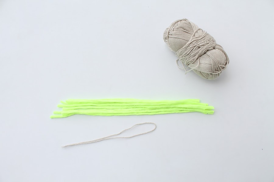 Cortar 8 tiras de trapillo de aproximadamente 24 cm cada una (dependiendo del grosor del trapillo y del resultado que queramos para la borla podemos añadir o quitar tiras o cortarlas más o menos largas)