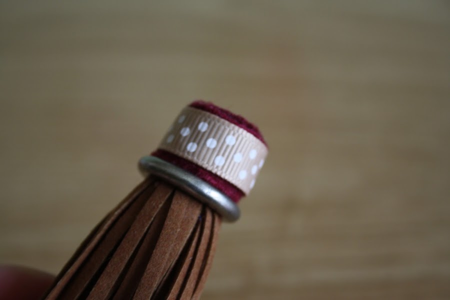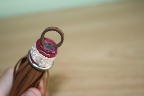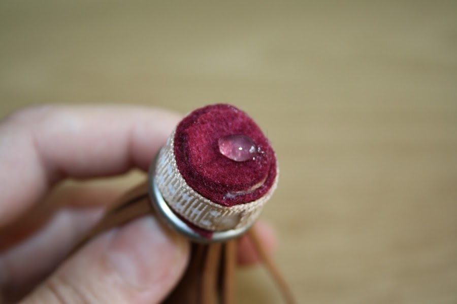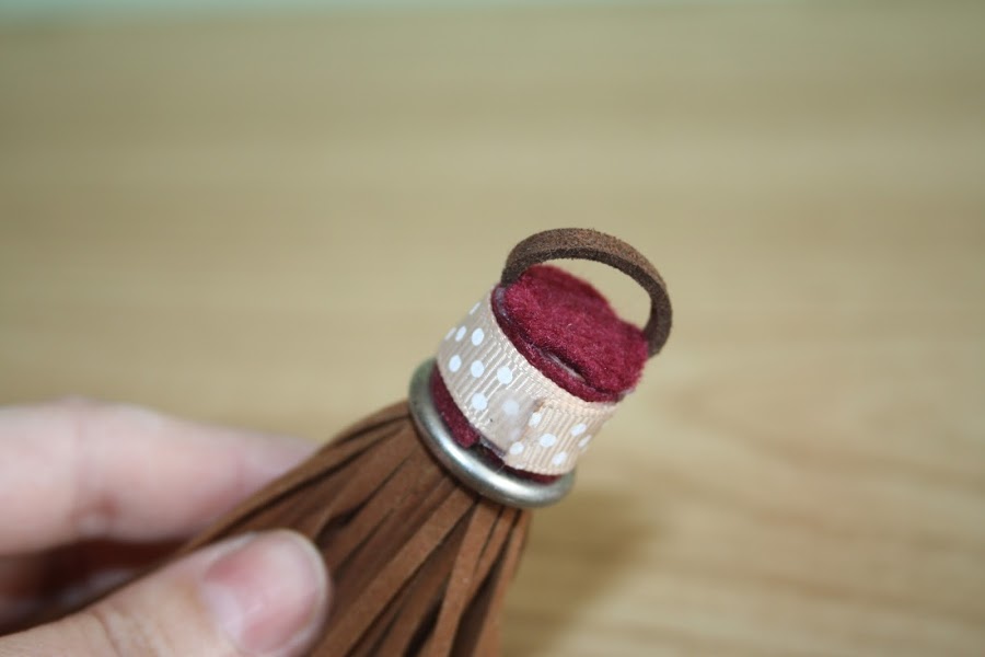 Tapamos la parte de arriba como si fuera un tapón y a continuación le pegamos el cordón de serraje para poder colgar.