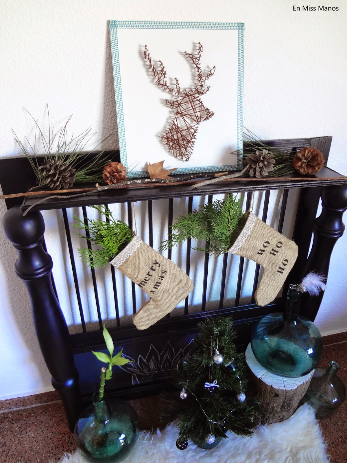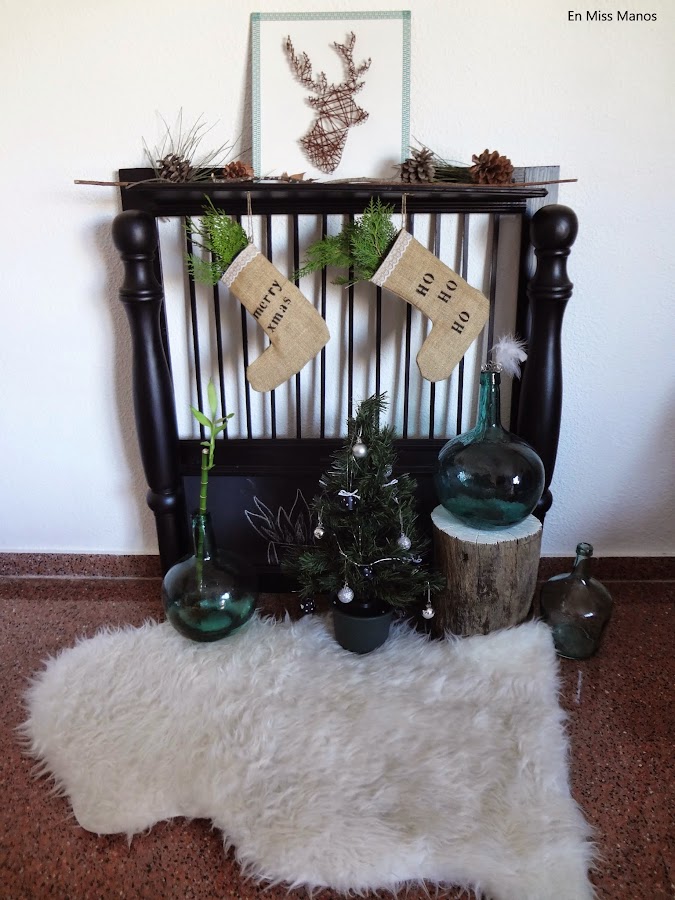 Como se ve en las imágenes he cambiado un poquito la deco de la chimenea, añadiendo piñas, hojas de pino, ramas...y colocado el reno en la parte central, para adaptarla a estas fechas de la forma más natural posible. Las damajuanas con el tronco he decidido dejarlas ahí porque se adaptan perfectamente al conjunto ¿no creéis?