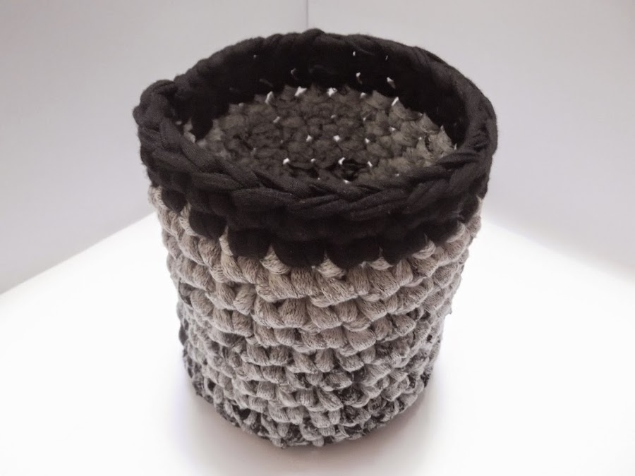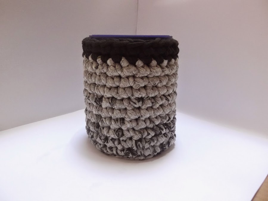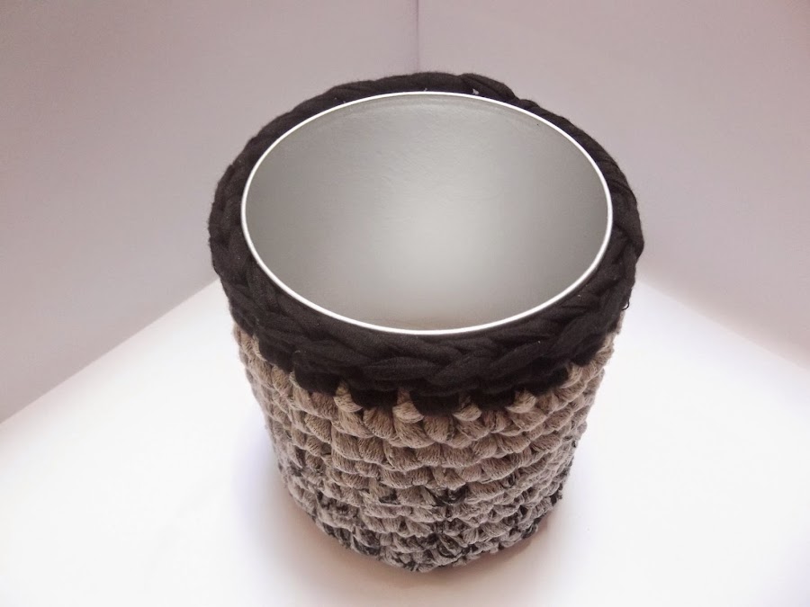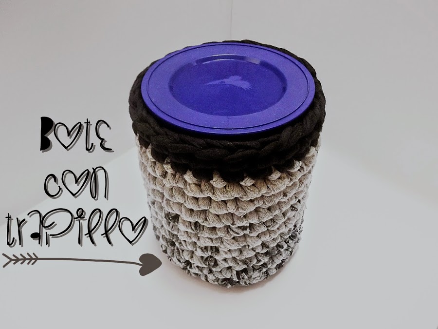 el cuál forramos con una cesta de trapillo color gris con borde negro. Está hecha a 24 puntos de base, y tantas vueltas de altura como es de alto el bote.