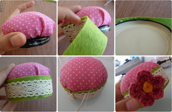 Normalmente utilizan tarros más grandes, y los usan como costurero. Por mi lado, como sabía que de costurero se me iba a quedar pequeño de todos modos, decidí hacerlo más menudito y darle otro uso. La verdad que es muy fácil de hacer, y lo único que me fastidió es no tener un tarro de esos de los que se ven por Internet cuya tapa se separa en dos partes y deja justo un hueco central, perfecto para hacer el alfiletero. Pero vaya, tampoco es problema, porque yo he utilizado en su lugar un tarrito de paté, y ya veis que no queda nada mal.