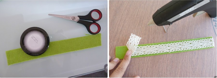 ? A continuación corté una tira de fieltro de unos 3cm de ancho y un largo un poco mayor que la longitud de la circunferencia de la tapa ( es decir, que tiene que ser tan largo como para poder rodear la tapa y que sobre un poquito). Corté también un trocito de cinta de encaje de la misma longitud.
