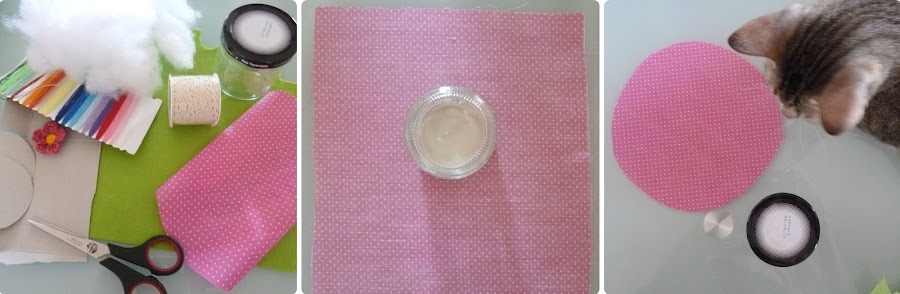 ? Lo primero que hice fue dibujar en la tela un círculo del doble de diámetro que mi tarrito de paté y recortarlo.