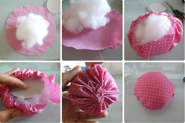 1. Cogeremos un puñado de relleno de cojín que lo pondremos en el centro del círculo de tela.