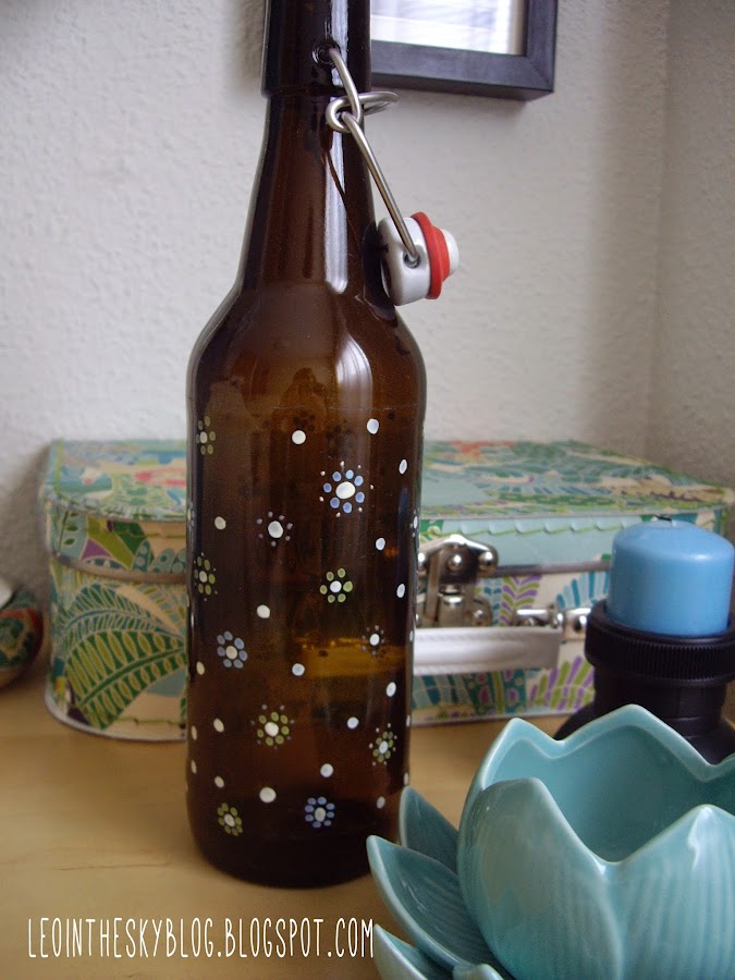 Tercer paso: Pintar con los esmaltes de uñas. Si se trata de una botella transparente podréis usar cualquiera, pero si es una oscura como la mía es mejor usar colores lo más opacos posibles y que contrasten con el color de la botella ya que si no no se verán muy bien.