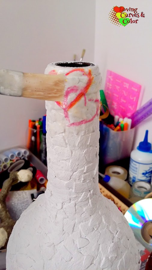 Ya seca la pintura tocaba pegar los pedazos de papel sobre la botella y aquí esta la técnica... primero coloqué el trozo de papel sobre la superficie (botella) y encima de este pasé el pincel con el pegamento desde el centro hacia afuera, aquí has de tener cuidado ya que el papel es muy finito y si lo humedeces mucho perderá las formas.y se te puede romper el papel.