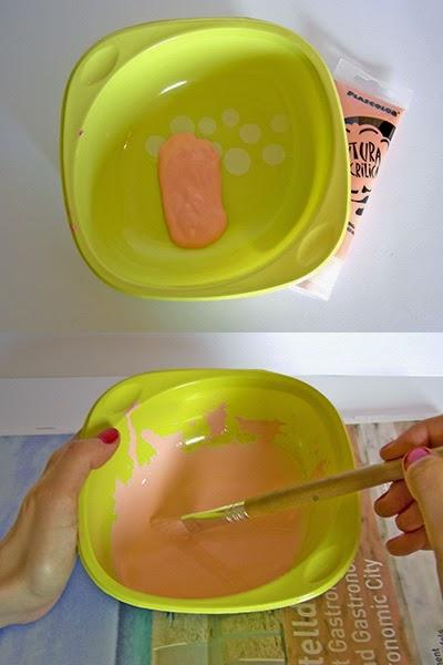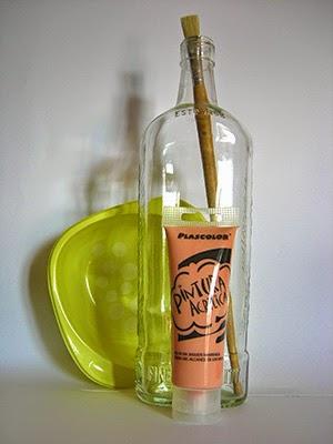 Vierte en un recipiente un poco de pintura acrílica. Dilúyela con un poco de agua, pero cuidado, una cucharadita de café como mucho. Tendrás que obtener una mezcla lo suficientemente líquida para distribuirla bien por la botella, pero que no llegue a clarear.