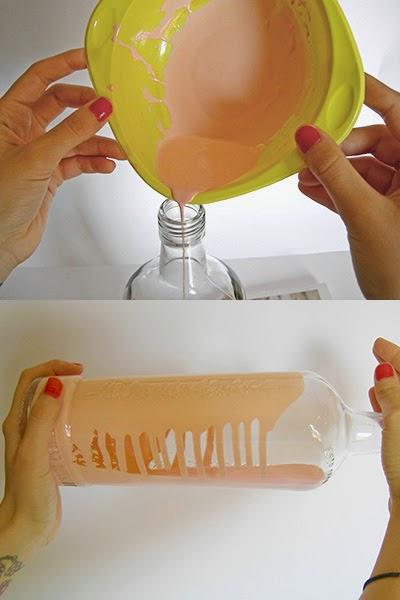 Vierte la mezcla de pintura por el cuello de la botella, y ve girándola e inclinándola para repartir bien la pintura. Si la botella no es muy grande y puedes tapar bien el cuello con la palma de la mano, agítala y en unos segundos tendrás lista tu botella.
