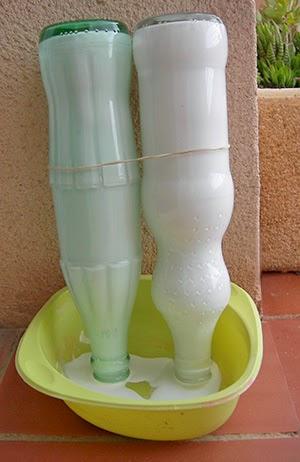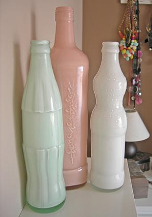 Botellas de cristal. Puedes reutilizar cualquier botella que tengas por casa, ya sea lisa o con alguna forma bonita. Si el cristal es de algún color, tendrás que tenerlo en cuenta a la hora de elegir la pintura. Por ejemplo, si utilizas una botella de Coca-Cola, que son verdes oscuras, y utilizas pintura blanca, te quedará un bonito color menta.