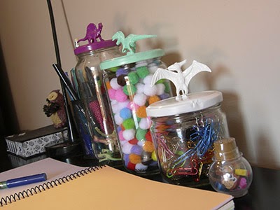 Llena el bote con lo que quieras (yo he metido clips de colores y bolitas de fieltro que utilizo para manualidades, para darle un toque de color a mi escritorio), enrosca la tapa molona...