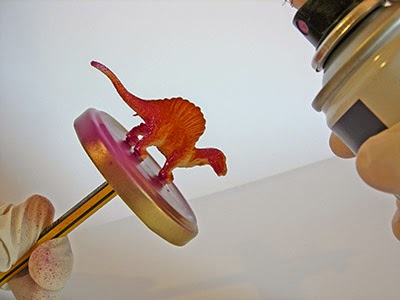 Escoge la figura que más te guste. Yo he escogido unos muñequitos de dinosaurios. Pégalo a la tapadera con el material que mejor se adapte a tus necesidades (recuerda, si la superficie de la figura es muy irregular o porosa, utiliza preferentemente una pistola de silicona).