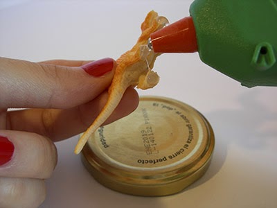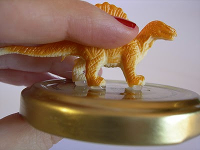 Escoge la figura que más te guste. Yo he escogido unos muñequitos de dinosaurios. Pégalo a la tapadera con el material que mejor se adapte a tus necesidades (recuerda, si la superficie de la figura es muy irregular o porosa, utiliza preferentemente una pistola de silicona).