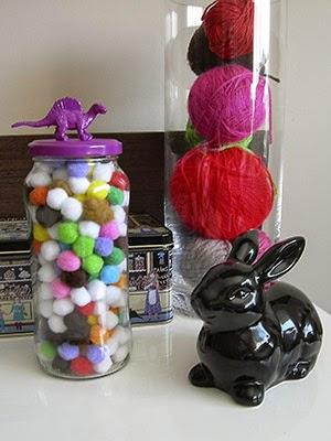 Llena el bote con lo que quieras (yo he metido clips de colores y bolitas de fieltro que utilizo para manualidades, para darle un toque de color a mi escritorio), enrosca la tapa molona...