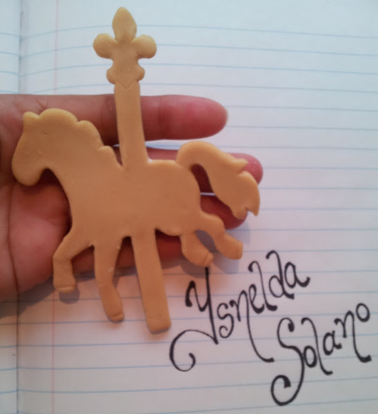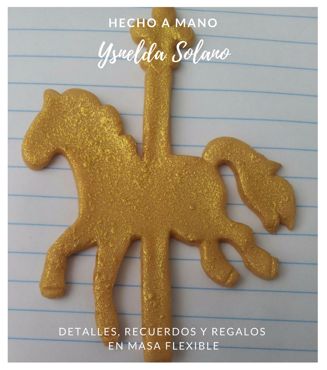 En esta entrada, les traigo una pieza bastante sencilla, pero muy útil al momento de decorar una fiesta de cumpleaños con tema Carrusel, se trata del caballito del mismo, del sube y baja. Realizado totalmente en porcelana fría y chispeado en color dorado. Para su realización utilicé los siguientes materiales: