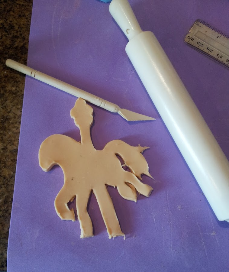 Usando el contorno de la figura, diseñamos el modelo, en mi caso seguí las indicaciones de la solicitud del cliente. Ya con el patrón en mano, estiramos una porción de porcelana fría y con la esteca marcamos la figura.
