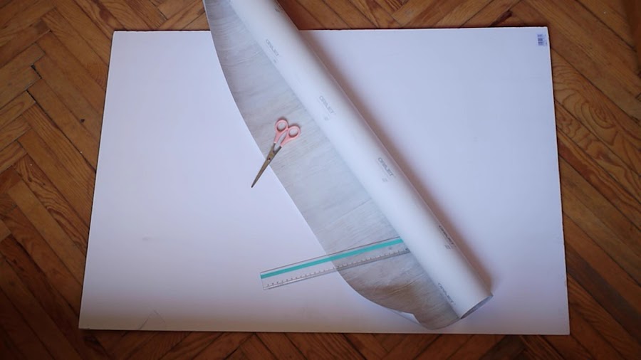 Trabaja sobre una superficie amplia y despejada porque vas a necesitar cierto movimiento. Yo he he puesto en el suelo porque si no no entraba todo el cartón pluma en la cámara para que lo vierais bien jeje. El primer paso es colocar el cartón sobre el vinilo de madera, marcar lo que mide y recortar el exceso de vinilo para que encaje.
