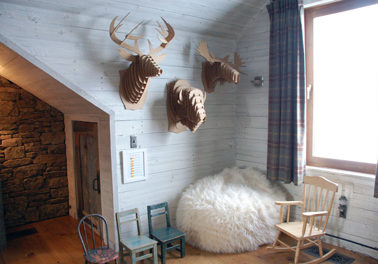 Lo que también queda genial es hacer un rincón especial y colocar varias cabezas de diferentes animales. Este en concreto es de una casa nórdica, una zona para que la madre les lea cuentos a los hijos y no me puede gustar más.