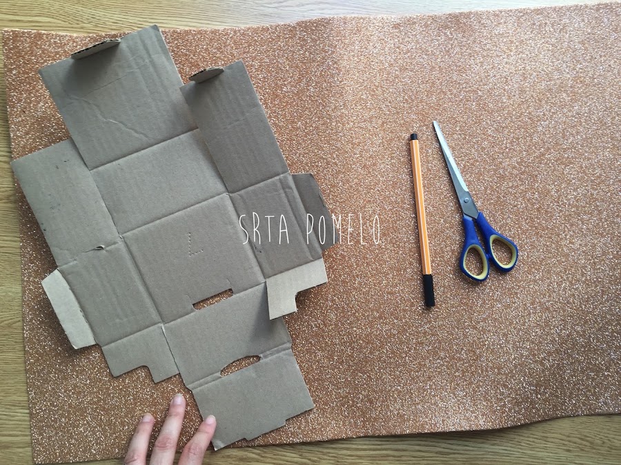 Necesitaremos: un pliego de goma eva (lisa, estampada o con brillantina, como más os guste), molde o plantilla de otra caja que tengáis por casa y que sea fácil de desmontar, rotulador o lápiz para marcar la goma eva, tijeras y pegamento o silicona (caliente o fría).