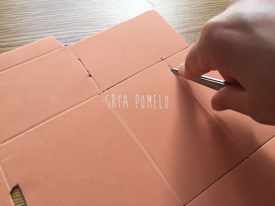Recortamos todas las líneas marcadas y por las zonas de los dobleces, marcamos con la parte roma de la tijera, para que sea más fácil poder doblar esas partes. No apretéis mucho, ya que la goma eva se podría romper por ese sitio.