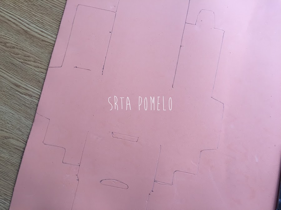 Después vamos a marcar sobre el reverso de la goma eva todo el contorno de la plantilla, marcando las zonas de los dobleces y las solapas.