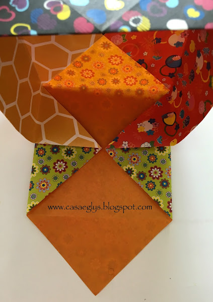 Ahora desdobla sólo 2 lados, que te quede algo así. En este paso puedes pegar un poco de cinta adhesiva en el centro para que queden fijas las puntas y no se muevan.
