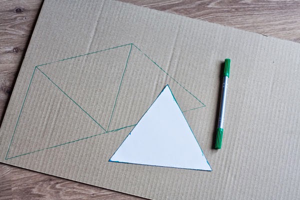 Primero, tenéis que dibujar vuestros 15 triángulos sobre el cartón. Para hacerlo, podéis dibujar un triángulo equilátero en Word, por ejemplo, cortarlo y usarlo como plantilla. Podéis dibujar varios triángulos juntos, que os faciliten el trabajo de pegarlos. Pero dependerá del tamaño de vuestro cartón. Si queréis cortar vuestra caja de una sola pieza, podéis descargar el patrón aquí.
