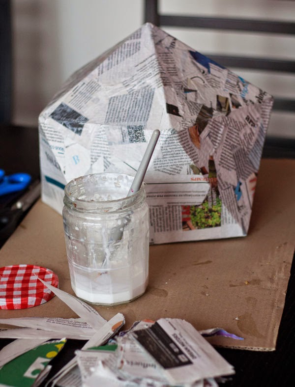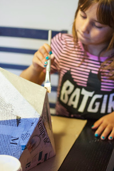 Seguro que ya tenéis el gesso seco y listo para trabajar. Menos mal, porque ahora os espera la parte más tediosa de todo el proceso. Hay que poner varias capas de papel maché. Para hacerlo, podéis mojar directamente el periódico en la cola, o podéis aplicar cola a la caja, pegar un pedazo de papel de periódico y después pasarle el pincel bien cargado de cola por encima.